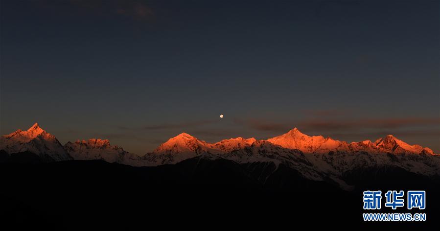 這是3月25日清晨拍攝的梅里雪山“日月同輝”景觀。梅里雪山位于滇藏交界的云南省迪慶藏族自治州德欽縣境內(nèi),是世界自然遺產(chǎn)“三江并流”的主要自然景觀之一。梅里雪山常年云霧籠罩,太陽(yáng)光只在少數(shù)天晴的清晨照射在雪山頂上,形成絕美的“日照金山”美景。有時(shí)月亮尚未落山,太陽(yáng)已經(jīng)升起,更是形成了難得一見的梅里雪山“日月同輝”奇觀。新華社記者 王長(zhǎng)山 攝