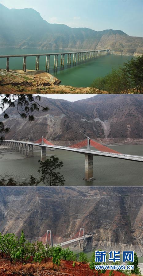 雅西高速瀑布溝庫區(qū)路段3座跨大渡河特大橋:青杠嘴特大橋(上圖)、觀音巖特大橋(中圖)、蘇村壩特大橋(下圖,拼版照片,攝于2012年4月12日)。1935年5月24日、25日間,紅軍“十七勇士”在槍林彈雨中,以一條木船強行從安順場渡河,在國民黨軍視為天險的大渡河防線上,撕開了一個缺口,為紅軍沿大渡河兩岸夾河北上奪占瀘定橋創(chuàng)造了有利條件。 “紅軍不怕遠征難,萬水千山只等閑。”長征譜寫了一曲人類征服自然的凱歌,峽谷激流、雪山草地、物資匱乏、生命禁區(qū),這一切都不能阻擋紅軍前進的步伐。80年過去,滄海桑田,紅軍長征走過的荒郊野嶺,如今樓宇林立,欣欣向榮;徒步翻越的大山、攻克的關(guān)隘、沼澤遍布的草地、泅渡的河流,修起了通暢快捷的公路和大橋……長征之路發(fā)生了翻天覆地的變化,昔日的艱難險阻正漸漸變成康莊通途。新華社記者江宏景攝
