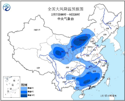 據(jù)中央氣象臺網(wǎng)站消息,2月7日06時繼續(xù)發(fā)布寒潮藍色預(yù)警:預(yù)計,受寒潮影響,7日至9日,我國中東部大部地區(qū)自北向南將先后出現(xiàn)大范圍大風(fēng)降溫和雨雪天氣,平均氣溫將普遍下降4℃以上,其中,青海東部、陜西北部、內(nèi)蒙古中部、山西北部、貴州東南部、湖南中南部、江西中南部、福建西部、廣西北部和廣東北部等地氣溫將下降8℃以上,局地超過10℃。長江以北地區(qū)并伴有4~6級偏北風(fēng),東部和南部海區(qū)風(fēng)力有7~9級。