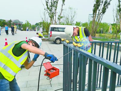上午9時(shí),安裝工作正在進(jìn)行,大約20只“小金鳥”陸續(xù)進(jìn)入最后的焊接階段?,F(xiàn)場(chǎng)施工負(fù)責(zé)人郭中戌師傅告訴記者,“和原來(lái)那批相比,小鳥的牢固程度增加了三倍以上。”記者看到,鋁制鳥身下方連接著一個(gè)長(zhǎng)而細(xì)的不銹鋼管,鋼管穿透護(hù)欄,欄桿上方的部分噴膠,欄桿下邊的部分?jǐn)Q緊螺絲后再加一層焊接。
