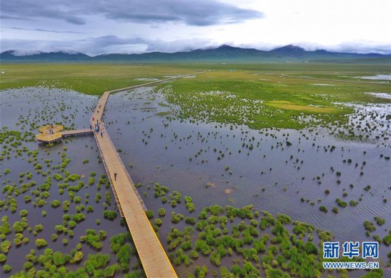 在位于四川省阿壩藏族羌族自治州若爾蓋縣西北部的花湖生態(tài)旅游區(qū),游人走在棧橋上欣賞美景(6月16日攝)。 新華社記者 沈伯韓 攝