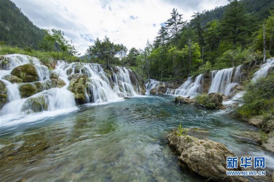 九寨溝風景名勝區(qū)內的“雙龍海瀑布”(6月18日攝)。新華社記者 沈伯韓 攝