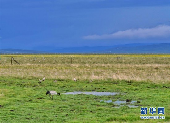 在位于四川省阿壩藏族羌族自治州若爾蓋縣的花湖生態(tài)旅游區(qū),一只黑頸鶴(前)和幾只灰雁在覓食(6月16日攝)。新華社記者 劉坤 攝