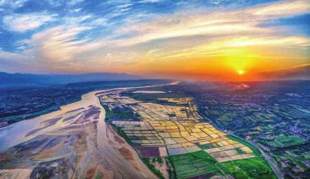 5月20日,垣曲縣古城鎮(zhèn)黃河庫(kù)區(qū)邊的曙猿灣村,波濤滾滾的黃河、生機(jī)勃勃的農(nóng)田,繪就一幅秀美的生態(tài)畫卷。