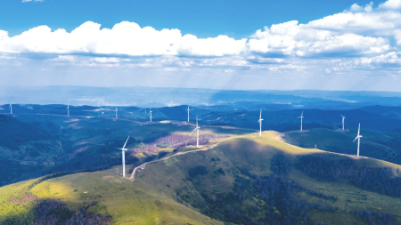 3.花坡景區(qū)聳立的風(fēng)電機(jī)組與綠草甸交相輝映,美不勝收。