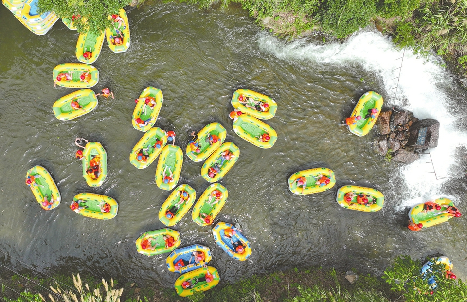 7月10日,湖南省衡陽(yáng)市衡陽(yáng)縣金蘭鎮(zhèn)聯(lián)龍村,游客在龍王峽漂流戲水(無(wú)人機(jī)照片)。連日來(lái),多地持續(xù)高溫,眾多市民和游客選擇親水消暑,享受夏日清涼。