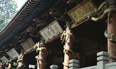 八條盤龍各抱定一根大柱,張口向前,怒目利爪,躍躍欲動,一派生氣。如今,雖近千年,木雕盤龍仍鱗片層層,須發(fā)根根,極其莊嚴威儀,難掩飛龍盤旋的氣勢。