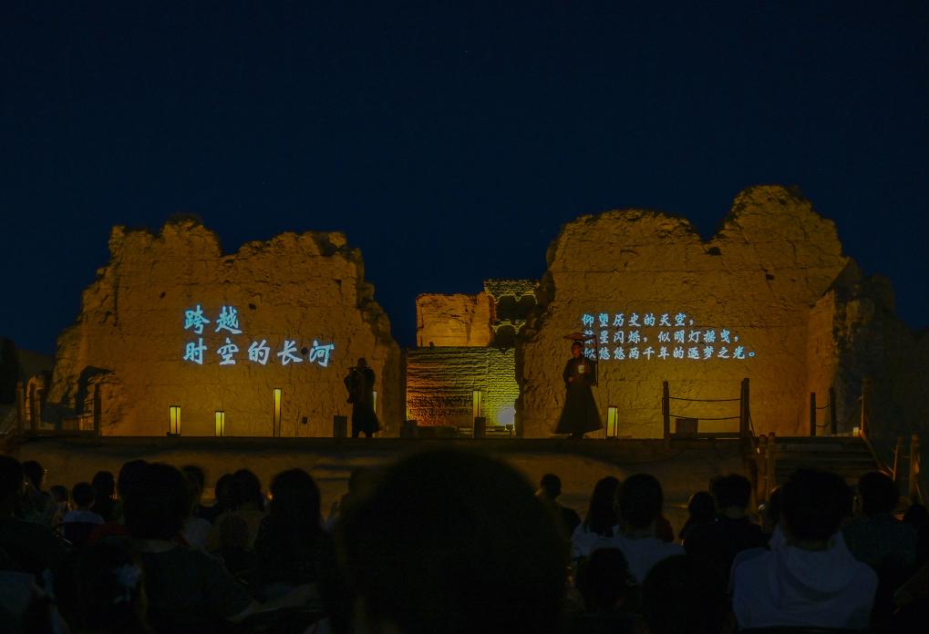 夜幕下的交河故城。(吐魯番市文物局交河故城文管所供圖) 這座城,東漢名將班超來(lái)過,唐玄奘西去求取真經(jīng)時(shí)路過,多少漢唐邊塞詩(shī)人走過……月色下,故城輪廓冷冽清晰,南北向兩條大道將居民區(qū)、寺院區(qū)、倉(cāng)儲(chǔ)區(qū)分為兩側(cè),建筑形制與唐代長(zhǎng)安城相仿,城市中部是官署區(qū),也是交河故城最高的地方。站在官署區(qū)高處,溫?zé)岬娘L(fēng)裹挾著砂礫,吹過身側(cè),游人好似跨越時(shí)空…… 夜游交河行至一半,影影綽綽的燈光,照亮通往大佛寺的路?!督缓又埂访褡逡魳窌?huì)實(shí)景演出開始上演。 深藍(lán)色夜幕下,兩排戶外燈照亮高大殘舊的城墻。身著僧侶服飾的演員雙手合十、懷抱經(jīng)卷,從夜色中走來(lái)。時(shí)鐘隨著他的朗誦,仿佛回轉(zhuǎn)到佛教鼎盛期的唐代西域。在舞臺(tái)前方席地而坐的游客,看得如醉如癡。 一人獨(dú)奏或三人合唱,音樂會(huì)上,長(zhǎng)笛聲與少數(shù)民族樂器熱瓦普、薩塔爾的樂聲在夜空下交織,文化交流融合之美如同繁星般閃爍。 “這是十二木卡姆的選段,”游客木尼熱聽到熟悉的旋律,眼眶泛紅,“兼具藝術(shù)性、民族性的曲目,與故城的歷史與景致相得益彰,實(shí)在不虛此行。”