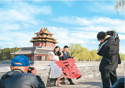 一對情侶在北京故宮角樓處拍攝新婚照片。新華社記者 李 賀攝