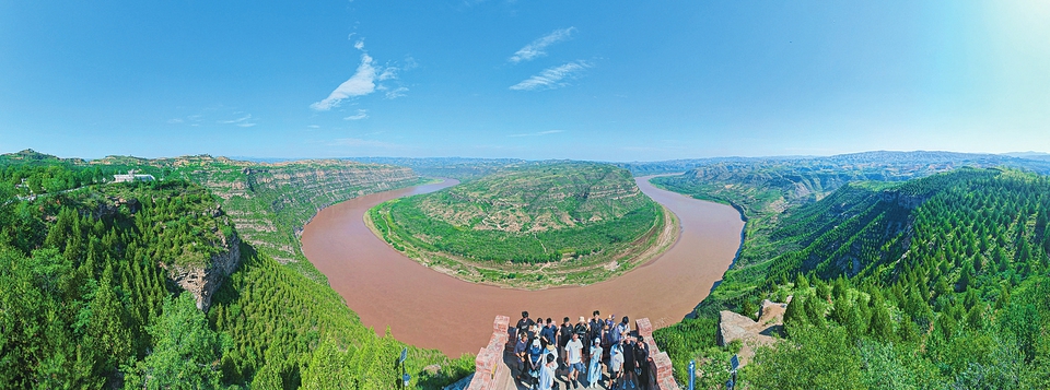 8月19日,游客在永和縣乾坤灣景區(qū)游覽觀光、合影留念。近年來,該縣不斷提高當(dāng)?shù)厣指采w率,并依托紅色旅游資源發(fā)展文旅經(jīng)濟,把東征村156孔窯洞改造成民宿旅館,增加了村集體和村民收入。