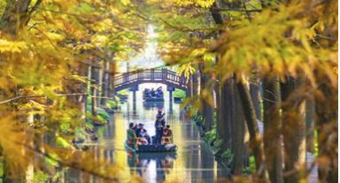 初冬時節(jié),江蘇興化里下河國家濕地公園層林盡染、色彩斑斕,如畫美景吸引不少游客前來游玩。周社根攝(人民圖片網(wǎng))