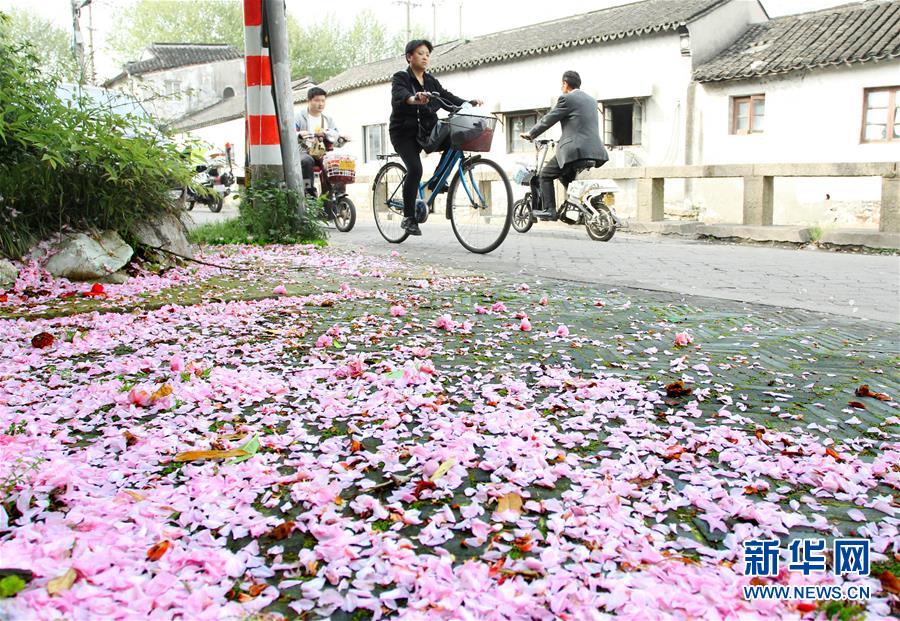 4月17日,一場春雨過后,蘇州市民騎車經(jīng)過落滿櫻花的盛家?guī)?。新華社發(fā)(王建中 攝)