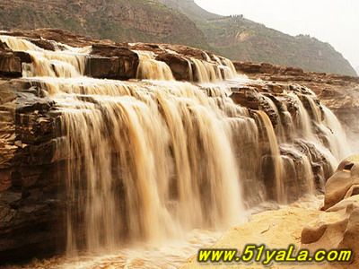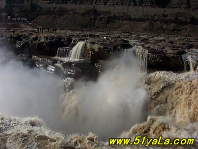 壺口瀑布位于吉縣城西45公里、距臨汾市165公里處的晉陜峽谷黃河河床中,為世界上最大的黃色瀑布,因其氣勢雄渾而享譽(yù)中外。此地兩岸夾山,河底石巖上沖刷成一巨溝,寬達(dá)30米,深約50米,滾滾黃水奔流至此,倒懸傾注,若奔馬直入河溝,波浪翻滾,驚濤怒吼,震聲數(shù)里可聞。其形如巨壺沸騰,故名。黃河浪濤激起一團(tuán)團(tuán)霧煙云隨著水霧的升高,煙云由黃變灰、由灰變藍(lán),景色奇麗,有“水底生煙”之說。壺口瀑布不僅有“水底冒煙”,“彩橋通天”奇景,更有“旱地行船”之說。上游船只到此,必須離水登陸,經(jīng)人抬或車運(yùn)繞過壺口(即所謂“旱地行船”)方可入水續(xù)航,千百年來,概莫能變。