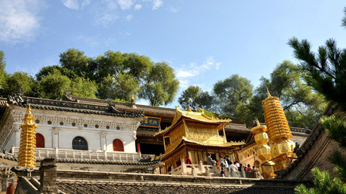 顯通寺的大雄寶殿為舉行佛事活動(dòng)主要場(chǎng)所,是顯通寺的第三重大殿,殿內(nèi)供著三尊佛像:中是釋迦牟尼佛,西是阿彌陀佛,東是藥師佛;兩旁有十八羅漢像背后有觀(guān)音、文殊、普賢三尊菩薩像。觀(guān)音殿殿內(nèi),中間供著觀(guān)音菩薩像,左右供著文殊和普賢菩薩像。大文殊殿,是顯通寺的第二重大殿。大文殊殿內(nèi),供著七尊文殊菩薩像:正中的為大智文殊;前面的五位,從左至右,依次為西臺(tái)獅子文殊,南臺(tái)智慧文殊,中臺(tái)孺者文殊,北臺(tái)無(wú)垢文殊,東臺(tái)聰明文殊;大智文殊后面是甘露文殊。文殊像前有護(hù)法神韋馱像,兩側(cè)有十八羅漢像。