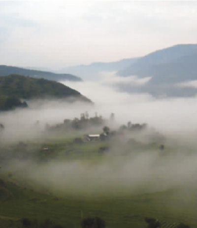 炊煙裊裊的村莊,偷偷地從薄霧里露出惺忪的臉來,時隱時現(xiàn),猶如傳說中的蓬萊仙島。一個個白族村莊沉浸在美輪美奐的仙境之中,整個峽谷布滿著一幅幅精美絕倫的淡墨山水畫??上У氖谴逯械娜藗冞€未品嘗出做神仙的滋味,霧海就隨著江面吹來的西風(fēng)越升越高,不一會兒,就向羅平山頂飄襲而來。我們幾個觀霧者迅即被淹沒在濃濃的云山霧海中,成了騰云駕霧的神仙了。遺憾的是我們還未過足神仙癮,那些飄蕩在山頂?shù)脑旗F就被熱烈而耀眼的太陽光收回去了,讓我們不得不回到人間,仍去做原來的凡夫俗子。