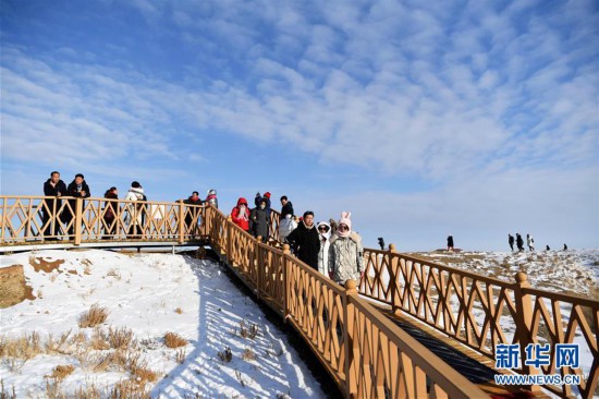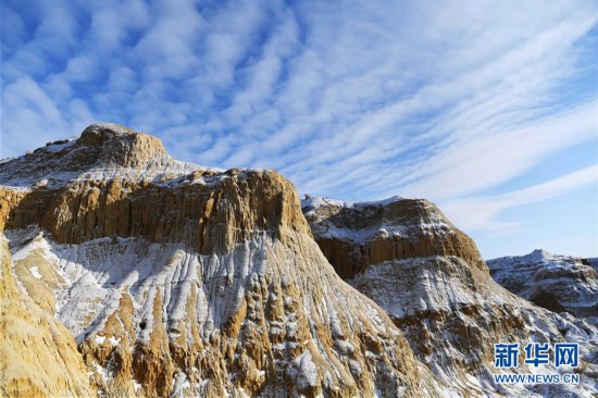 11月26日拍攝的新疆福??h烏倫古湖海上魔鬼城景區(qū)美景。 福海縣烏倫古湖海上魔鬼城景區(qū)位于新疆阿勒泰地區(qū)福??h吉力湖東岸,有著獨(dú)特的雅丹地貌和水域景觀,是當(dāng)?shù)刂穆糜蝿俚亍?新華社記者 沙達(dá)提 攝
