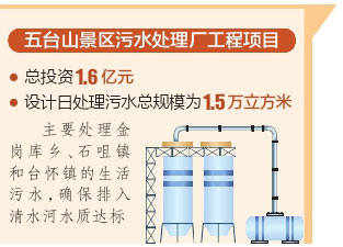 五臺山景區(qū)污水處理廠工程項目總投資1.6億元,設(shè)計日處理污水總規(guī)模為1.5萬立方米,主要處理金崗庫鄉(xiāng)、石咀鎮(zhèn)和臺懷鎮(zhèn)的生活污水,確保排入清水河水質(zhì)達(dá)標(biāo)。