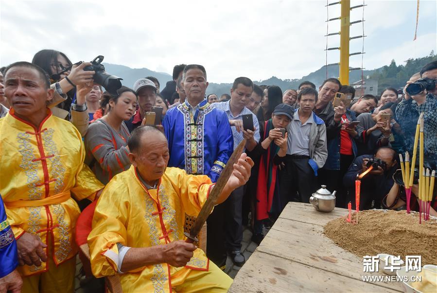 農(nóng)歷十月十五前后,福建西部武平縣各山村陸續(xù)進(jìn)入農(nóng)閑時(shí)節(jié)。按照當(dāng)?shù)仫L(fēng)俗,不同村子各自擇日舉辦民間活動(dòng),其中較有代表性的就是“上刀山”絕技?!吧系渡健苯^技在閩西山村流傳已有數(shù)百年歷史,表演者需光腳順著磨得鋒利閃亮的36把鋼刀,攀登至8米高的杉木柱子頂部,接受長者祝福,祈求風(fēng)調(diào)雨順、五谷豐登。新華社記者 宋為偉 攝