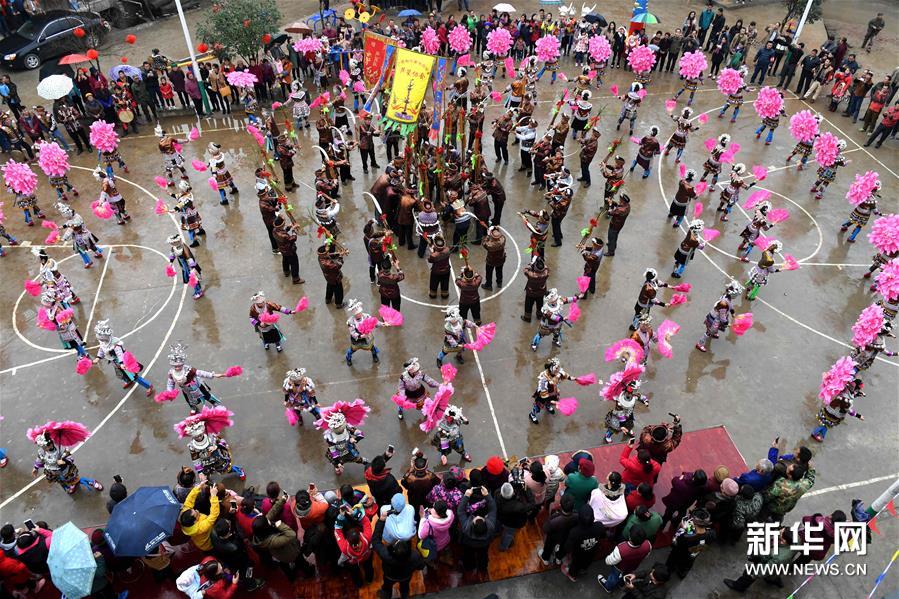 2月7日,廣西融水苗族自治縣安太鄉(xiāng)苗族群眾開(kāi)展傳統(tǒng)的“打同年”民俗活動(dòng)。當(dāng)?shù)財(cái)?shù)百名苗族同胞與游客們歡聚一堂,一起開(kāi)展對(duì)歌、蘆笙踩堂、文藝晚會(huì)等活動(dòng),歡慶新春佳節(jié)。 “打同年”是融水苗族村寨的一種民俗,即友好村寨之間的拜年聯(lián)歡活動(dòng)。新華社記者 李斌 攝