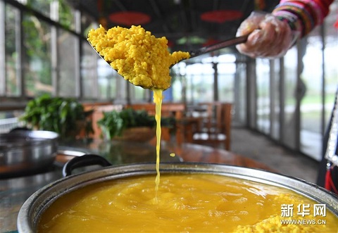 3月25日,在廣西上林縣巷賢鎮(zhèn),一名壯族村民在準備做五色糯米飯。新華社記者 陸波岸 攝