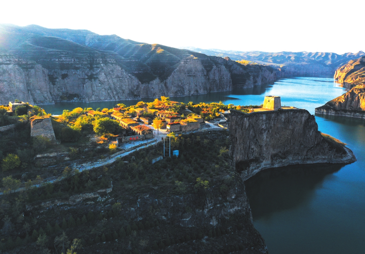 2015年的夏天,我又一次來到老牛灣,105米高的萬家寨水電大壩飛跨晉蒙,黃河水在絕壁中安靜了、變綠了。老牛灣村前的小河倒灌進(jìn)了黃河水,一個灣成了兩個灣,團(tuán)團(tuán)地圍住了山村,又好似老牛彎出了兩個碧綠的牛角,太漂亮了。老鄉(xiāng)們說:“有企業(yè)來開發(fā)道路、景區(qū)了,也有北京游客開車來游玩了,拍照的多,照幾張相就走了?!蓖侨匀粴埰频拈T樓和石板院房,我不知該說什么、能說什么。
