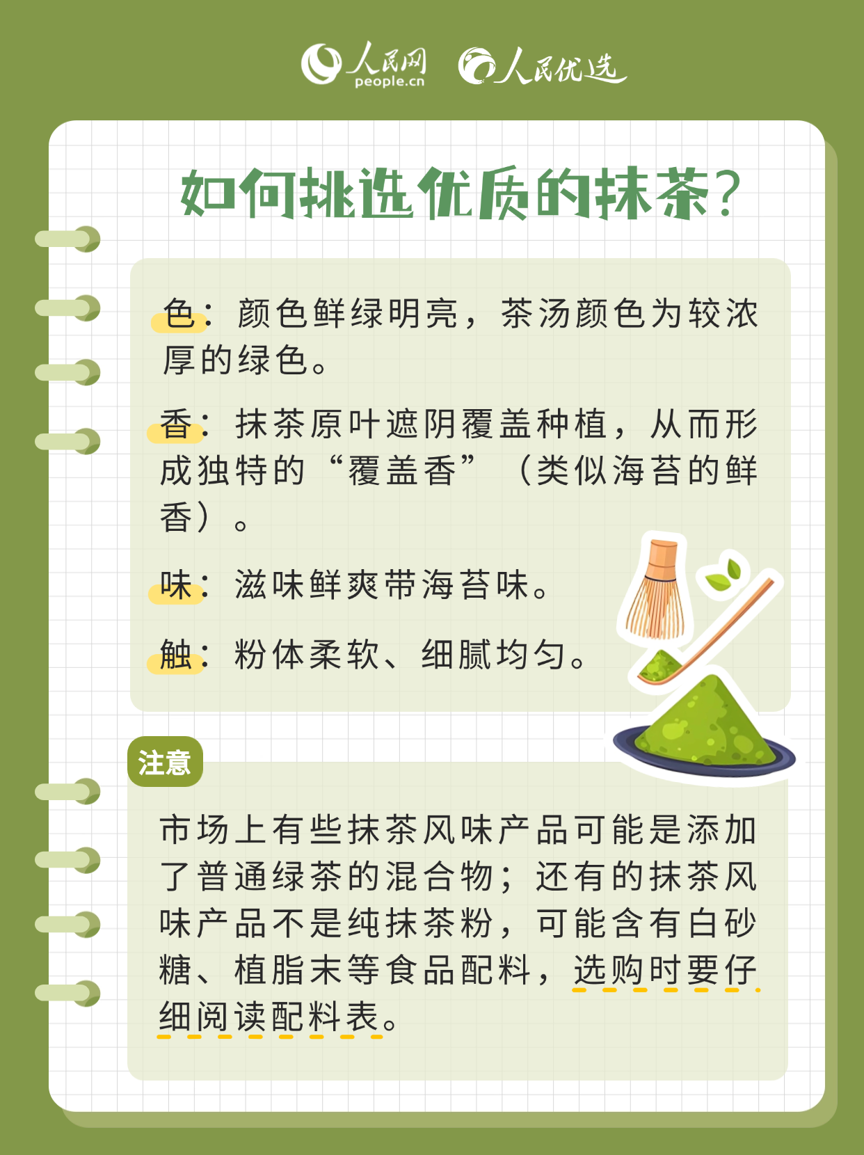 抹茶因香氣獨(dú)特、口感層次豐富、色澤翠綠悅目,受到很多人的喜愛。市面上抹茶冰淇淋、抹茶蛋糕、抹茶飲品等各種抹茶風(fēng)味制品層出不窮。抹茶到底是什么茶?選購抹茶應(yīng)留意什么?本期《人民優(yōu)選來了》,帶您讀懂這抹綠。