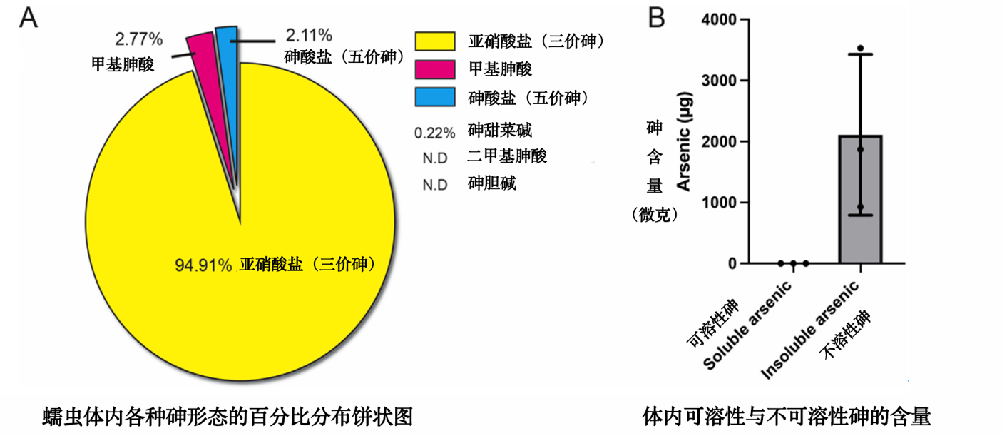 A:蠕蟲(chóng)體內(nèi)各種砷形態(tài)的百分比分布;B:體內(nèi)可溶性與不可溶性砷的含量 (圖片來(lái)源:參考文獻(xiàn)[1]) 要知道,砷就是俗稱(chēng)的“砒霜”,是一種劇毒物質(zhì)。更令人震驚的是,這些砷中有92.21%都是毒性最強(qiáng)的三價(jià)無(wú)機(jī)砷。這個(gè)濃度比已知的“砷超富集生物”還要高出10倍。試想,如果一個(gè)60公斤的人體內(nèi)有這么高濃度的砷,其總含量相當(dāng)于600克純砒霜——如此劑量足以對(duì)數(shù)百名成年人造成致命威脅,遠(yuǎn)遠(yuǎn)超出了個(gè)體中毒的范疇。 那么,為什么這種蠕蟲(chóng)卻沒(méi)有被毒死?這得從它那身明亮的黃色說(shuō)起。在深海的永恒黑暗中,大多數(shù)生物都是灰白色或深紅色,蠕蟲(chóng)這身黃色便十分顯眼。