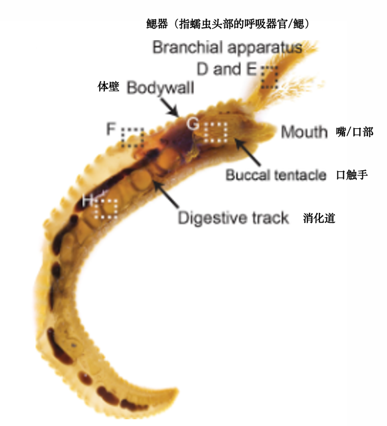 一只縱向切片的赫斯帕拉爾文氏蠕蟲(chóng)標(biāo)本 (圖片來(lái)源:參考文獻(xiàn)[1]) 通過(guò)顯微鏡觀察,科學(xué)家發(fā)現(xiàn)蠕蟲(chóng)的上皮細(xì)胞中充滿(mǎn)了直徑0.77-1.29微米的黃色顆粒。這些顆粒不僅存在于體表,還分布在鰓、口觸手和消化道中——所有與海水直接接觸的部位。