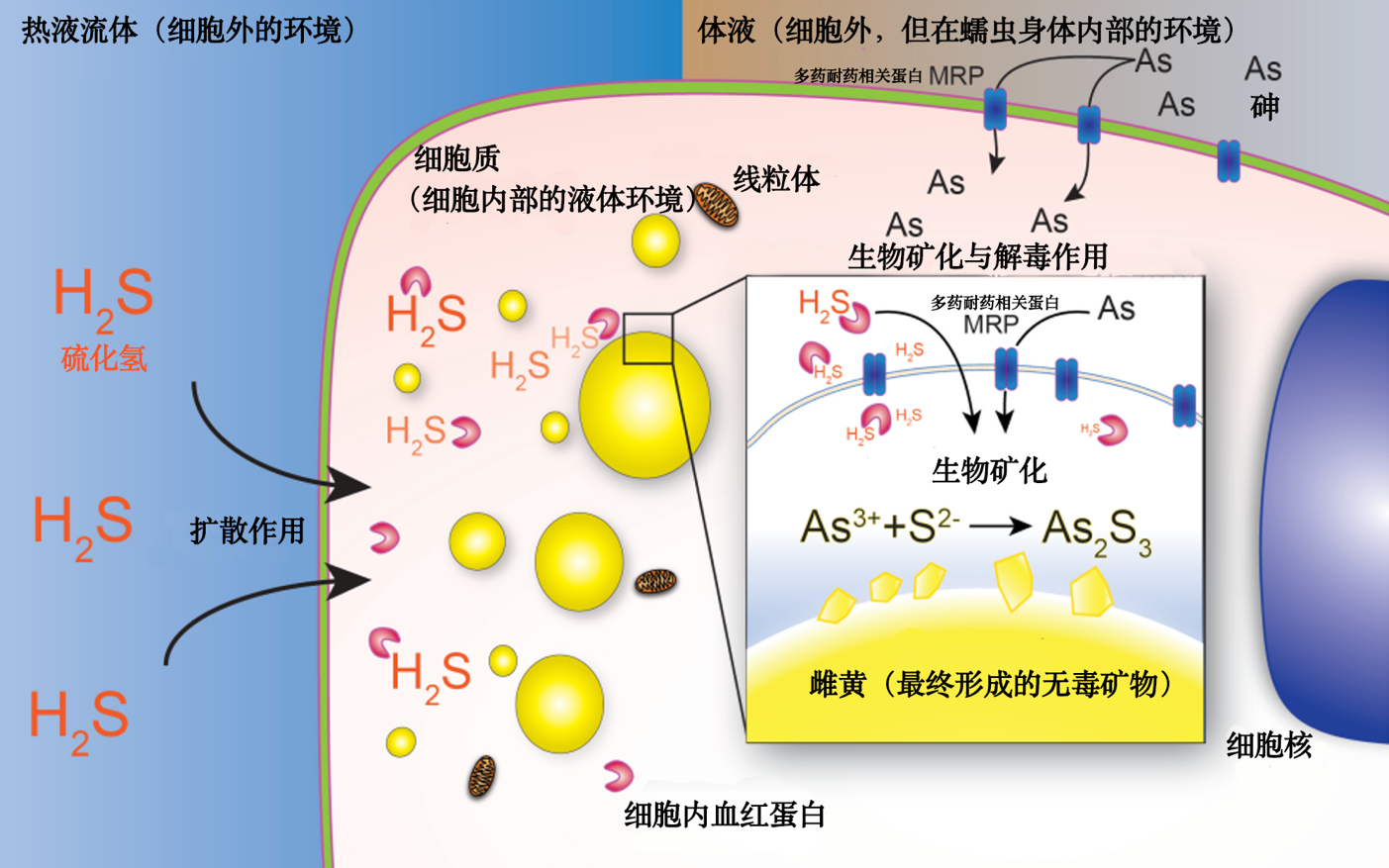 電鏡掃描下的黃色顆粒 (圖片來(lái)源:參考文獻(xiàn)[1]) 雌黃是什么?這是一種明亮的黃色礦物,在古代曾被用作顏料。有趣的是,它出現(xiàn)在倫勃朗和塞尚等大師的畫(huà)作中。但更重要的是,雌黃的毒性比其組成元素(砷和硫化氫)低約10倍。 這就像把兩種劇毒調(diào)配在一起,反而“煉制”出了相對(duì)無(wú)害的物質(zhì)——堪稱(chēng)自然界真正的“以毒攻毒”! “煉金術(shù)”如何達(dá)成?從劇毒到礦物的完美轉(zhuǎn)化 那么,蠕蟲(chóng)是如何完成這個(gè)“煉金術(shù)”的呢?研究團(tuán)隊(duì)通過(guò)蛋白質(zhì)組學(xué)分析發(fā)現(xiàn)了關(guān)鍵線(xiàn)索。 首先要處理的是劇毒的砷??茖W(xué)家發(fā)現(xiàn),蠕蟲(chóng)細(xì)胞膜上遍布著一種名為多藥耐藥相關(guān)蛋白(Multidrug Resistance-associated Protein, MRP)的特殊蛋白質(zhì)。MRP蛋白可以被理解為細(xì)胞的“智能水泵”。在人類(lèi)醫(yī)學(xué)中,它因能將化療藥物泵出癌細(xì)胞,導(dǎo)致癌癥產(chǎn)生耐藥性而聞名。但在這只蠕蟲(chóng)體內(nèi),這個(gè)系統(tǒng)被賦予了新功能:處理環(huán)境毒素。 當(dāng)砷離子進(jìn)入細(xì)胞質(zhì),即將造成破壞時(shí),MRP蛋白會(huì)立刻識(shí)別并“抓住”它。隨后,MRP蛋白會(huì)消耗能量,像一個(gè)單向旋轉(zhuǎn)門(mén),強(qiáng)行將這些砷離子泵入一個(gè)名為囊泡(Vesicle)的封閉隔間里。這個(gè)囊泡就像一個(gè)“細(xì)胞級(jí)的防爆垃圾桶”,確保劇毒的砷被安全隔離,無(wú)法傷害細(xì)胞的其他部分。 與此同時(shí),另一種毒物——硫化氫,也正被悄無(wú)聲息地處理。執(zhí)行這項(xiàng)任務(wù)的是兩種特化的細(xì)胞內(nèi)血紅蛋白(intracellular Hemoglobin, iHem-1和iHem-2)。 這兩種血紅蛋白的結(jié)構(gòu)極為精巧。在它們的蛋白質(zhì)鏈條的第25位,有一個(gè)關(guān)鍵的氨基酸——半胱氨酸殘基(Cysteine residue)。形象地來(lái)說(shuō),蛋白質(zhì)就像一條由不同珠子串成的項(xiàng)鏈,每個(gè)珠子是一種氨基酸。半胱氨酸這個(gè)“珠子”的特殊之處在于它帶有一個(gè)硫原子,這個(gè)硫原子像一個(gè)“化學(xué)磁鐵”,對(duì)硫化氫有著極強(qiáng)的親和力。 當(dāng)硫化氫分子擴(kuò)散進(jìn)細(xì)胞,它會(huì)立刻被iHem蛋白上第25位的“卡扣”精準(zhǔn)地結(jié)合。隨后,這個(gè)“快遞員”便載著危險(xiǎn)的“包裹”,將其安全無(wú)誤地運(yùn)送到囚禁著砷的同一個(gè)囊泡里。 至此,兩種致命的毒物在“與世隔絕”的囊泡“反應(yīng)倉(cāng)”內(nèi)相遇了。在這個(gè)由雙層脂質(zhì)膜包裹的封閉空間里,環(huán)境被細(xì)胞精確調(diào)控:這里是還原性的、低溫的,且pH值接近中性。這些條件恰好是促進(jìn)砷和硫化氫發(fā)生化學(xué)反應(yīng),形成穩(wěn)定、不溶于水的雌黃晶體的最佳環(huán)境。于是,兩種液態(tài)的、高活性、高毒性的物質(zhì),就此結(jié)合成了一種固態(tài)的、惰性的、相對(duì)無(wú)害的礦物。毒性被永久地“鎖定”在了晶體結(jié)構(gòu)中。
