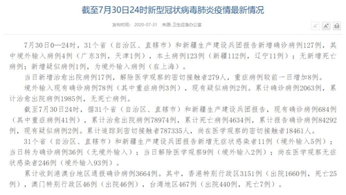 人民網(wǎng)北京7月31日電(董童)國(guó)家衛(wèi)生健康委于今日在官網(wǎng)發(fā)布的《截至7月30日24時(shí)新型冠狀病毒肺炎疫情最新情況》(以下簡(jiǎn)稱“情況”)提出,7月30日0—24時(shí),31個(gè)?。ㄗ灾螀^(qū)、直轄市)和新疆生產(chǎn)建設(shè)兵團(tuán)報(bào)告新增確診病例127例,其中境外輸入病例4例(廣東3例,天津1例),本土病例123例(新疆112例,遼寧11例);無新增死亡病例;新增疑似病例1例,為境外輸入病例(在上海)。當(dāng)日新增治愈出院病例17例,解除醫(yī)學(xué)觀察的密切接觸者279人,重癥病例較前一日增加8例。