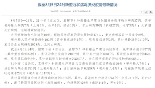 情況顯示,截至8月5日24時,據(jù)31個?。ㄗ灾螀^(qū)、直轄市)和新疆生產(chǎn)建設(shè)兵團(tuán)報(bào)告,現(xiàn)有確診病例837例(其中重癥病例34例),累計(jì)治愈出院病例79057例,累計(jì)死亡病例4634例,累計(jì)報(bào)告確診病例84528例,現(xiàn)有疑似病例2例。累計(jì)追蹤到密切接觸者795607人,尚在醫(yī)學(xué)觀察的密切接觸者23985人。