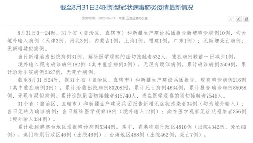 截至8月31日24時,據(jù)31個?。ㄗ灾螀^(qū)、直轄市)和新疆生產(chǎn)建設(shè)兵團報告,現(xiàn)有確診病例216例(其中重癥病例3例),累計治愈出院病例80208例,累計死亡病例4634例,累計報告確診病例85058例,無現(xiàn)有疑似病例。累計追蹤到密切接觸者815740人,尚在醫(yī)學(xué)觀察的密切接觸者7546人。