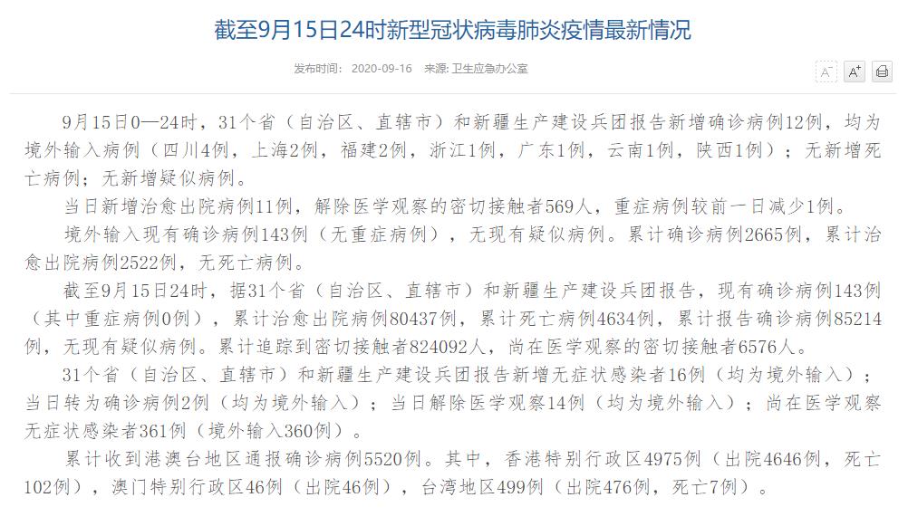 人民網(wǎng)北京9月16日電(董童)國家衛(wèi)生健康委于今日在官網(wǎng)發(fā)布的《截至9月15日24時新型冠狀病毒肺炎疫情最新情況》(以下簡稱“情況”)提出,9月15日0—24時,31個?。ㄗ灾螀^(qū)、直轄市)和新疆生產(chǎn)建設(shè)兵團(tuán)報告新增確診病例12例,均為境外輸入病例(四川4例,上海2例,福建2例,浙江1例,廣東1例,云南1例,陜西1例);無新增死亡病例;無新增疑似病例。當(dāng)日新增治愈出院病例11例,解除醫(yī)學(xué)觀察的密切接觸者569人,重癥病例較前一日減少1例。