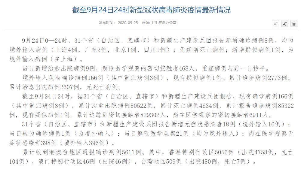 人民網(wǎng)北京9月25日電(董童)國家衛(wèi)生健康委于今日在官網(wǎng)發(fā)布的《截至9月24日24時(shí)新型冠狀病毒肺炎疫情最新情況》(以下簡(jiǎn)稱“情況”)顯示,9月24日0—24時(shí),31個(gè)省(自治區(qū)、直轄市)和新疆生產(chǎn)建設(shè)兵團(tuán)報(bào)告新增確診病例8例,均為境外輸入病例(上海4例,廣東2例,北京1例,四川1例);無新增死亡病例;新增疑似病例1例,為境外輸入病例(在上海)。當(dāng)日新增治愈出院病例9例,解除醫(yī)學(xué)觀察的密切接觸者468人,重癥病例與前一日持平。