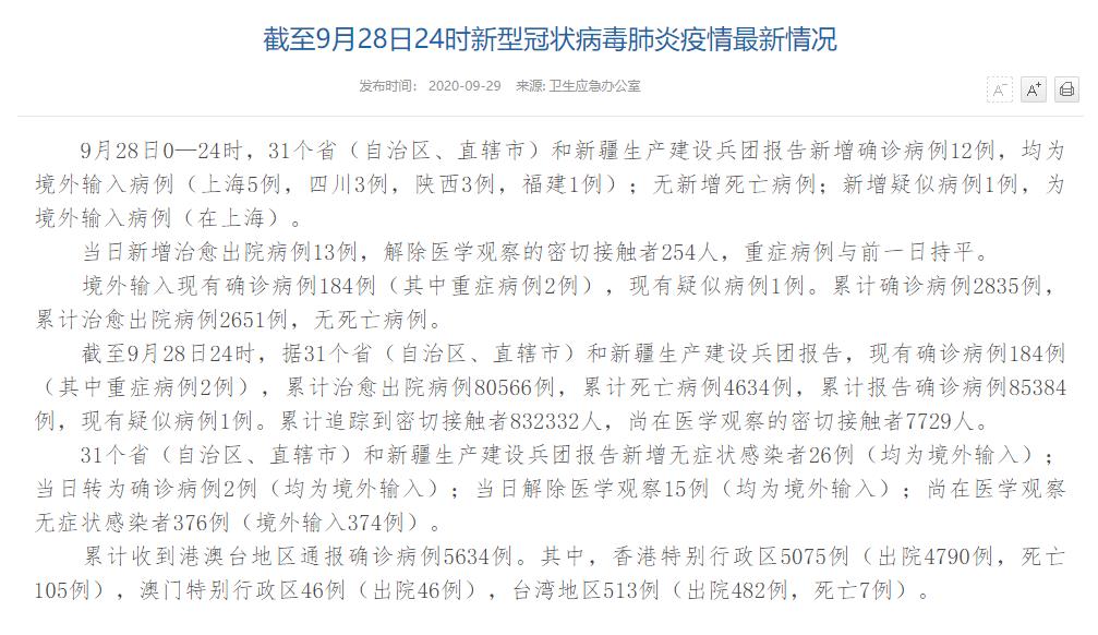 人民網(wǎng)北京9月29日電(董童)國家衛(wèi)生健康委于今日在官網(wǎng)發(fā)布的《截至9月28日24時新型冠狀病毒肺炎疫情最新情況》(以下簡稱“情況”)提出,9月28日0—24時,31個?。ㄗ灾螀^(qū)、直轄市)和新疆生產(chǎn)建設(shè)兵團(tuán)報(bào)告新增確診病例12例,均為境外輸入病例(上海5例,四川3例,陜西3例,福建1例);無新增死亡病例;新增疑似病例1例,為境外輸入病例(在上海)。當(dāng)日新增治愈出院病例13例,解除醫(yī)學(xué)觀察的密切接觸者254人,重癥病例與前一日持平。