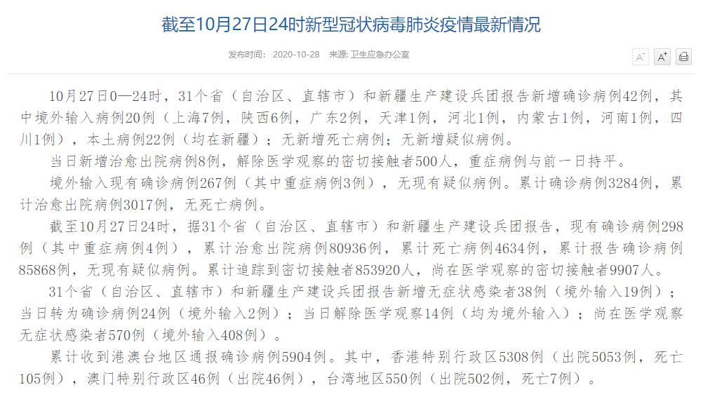 人民網(wǎng)北京10月28日電(董童)國(guó)家衛(wèi)生健康委于今日在官網(wǎng)發(fā)布的《截至10月27日24時(shí)新型冠狀病毒肺炎疫情最新情況》(以下簡(jiǎn)稱(chēng)“情況”)提出,10月27日0—24時(shí),31個(gè)?。ㄗ灾螀^(qū)、直轄市)和新疆生產(chǎn)建設(shè)兵團(tuán)報(bào)告新增確診病例42例,其中境外輸入病例20例(上海7例,陜西6例,廣東2例,天津1例,河北1例,內(nèi)蒙古1例,河南1例,四川1例),本土病例22例(均在新疆);無(wú)新增死亡病例;無(wú)新增疑似病例。當(dāng)日新增治愈出院病例8例,解除醫(yī)學(xué)觀察的密切接觸者500人,重癥病例與前一日持平。
