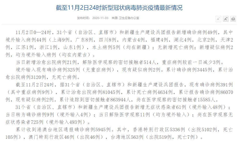 人民網(wǎng)北京11月3日電(董童)國(guó)家衛(wèi)生健康委于今日在官網(wǎng)發(fā)布的《截至11月2日24時(shí)新型冠狀病毒肺炎疫情最新情況》(以下簡(jiǎn)稱(chēng)“情況”)指出,11月2日0—24時(shí),31個(gè)?。ㄗ灾螀^(qū)、直轄市)和新疆生產(chǎn)建設(shè)兵團(tuán)報(bào)告新增確診病例49例,其中境外輸入病例44例(上海9例,廣東8例,四川8例,內(nèi)蒙古4例,福建4例,湖北4例,北京2例,天津2例,江蘇1例,浙江1例,山東1例),本土病例5例(均在新疆);無(wú)新增死亡病例;新增疑似病例2例,均為境外輸入病例(均在內(nèi)蒙古)。當(dāng)日新增治愈出院病例21例,解除醫(yī)學(xué)觀察的密切接觸者514人,重癥病例較前一日減少3例。