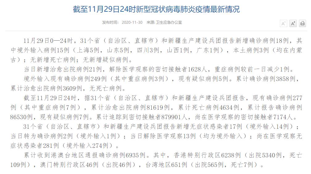 人民網(wǎng)北京11月30日電(董童)國家衛(wèi)生健康委于今日在官網(wǎng)發(fā)布的《截至11月29日24時(shí)新型冠狀病毒肺炎疫情最新情況》(以下簡(jiǎn)稱“情況”)指出,11月29日0—24時(shí),31個(gè)?。ㄗ灾螀^(qū)、直轄市)和新疆生產(chǎn)建設(shè)兵團(tuán)報(bào)告新增確診病例18例,其中境外輸入病例15例(上海5例,山東5例,四川3例,山西1例,廣東1例),本土病例3例(均在內(nèi)蒙古);無新增死亡病例;無新增疑似病例。當(dāng)日新增治愈出院病例21例,解除醫(yī)學(xué)觀察的密切接觸者1628人,重癥病例較前一日減少1例。