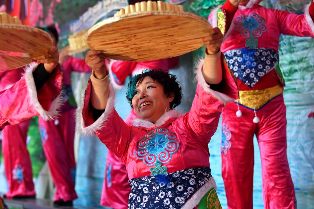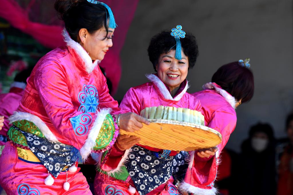 ↑1月3日,在山西省渾源縣荊莊村,渾源縣貧困山區(qū)合唱團在表演舞蹈《大豐收》。