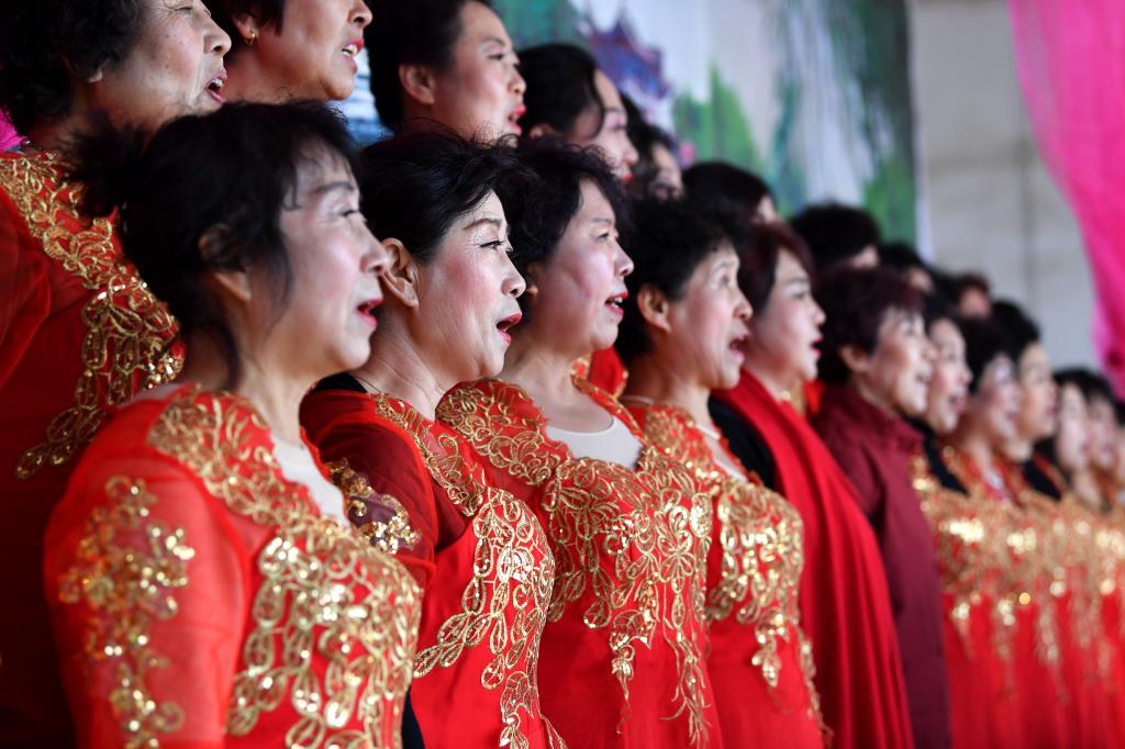 ↑1月3日,在山西省渾源縣荊莊村,渾源縣貧困山區(qū)合唱團在表演合唱《紅梅贊》。