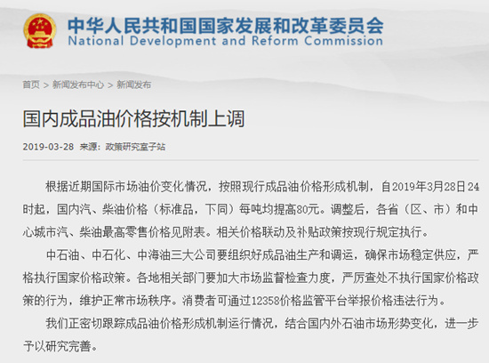人民網(wǎng)北京3月28日電 (王紹紹) 國家發(fā)改委剛剛發(fā)布通知, 根據(jù)近期國際市場油價(jià)變化情況,按照現(xiàn)行成品油價(jià)格形成機(jī)制,自2019年3月28日24時(shí)起,國內(nèi)汽、柴油價(jià)格(標(biāo)準(zhǔn)品,下同)每噸均提高80元。調(diào)整后,各?。▍^(qū)、市)和中心城市汽、柴油最高零售價(jià)格見附表。相關(guān)價(jià)格聯(lián)動(dòng)及補(bǔ)貼政策按現(xiàn)行規(guī)定執(zhí)行。