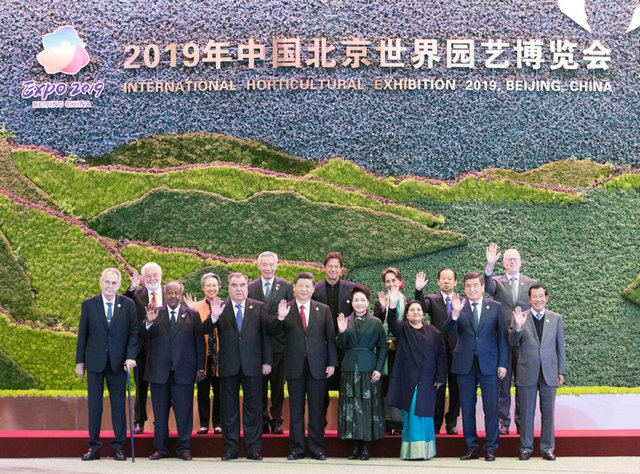 4月28日,國家主席習(xí)近平在北京延慶出席2019年中國北京世界園藝博覽會(huì)開幕式,并發(fā)表題為《共謀綠色生活,共建美麗家園》的重要講話。這是開幕式前,習(xí)近平和夫人彭麗媛同參加開幕式的外方領(lǐng)導(dǎo)人集體合影。新華社記者 黃敬文 攝