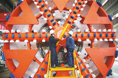 今年以來,濟南重工集團有限公司打造以軌道交通裝備產業(yè)為核心的智能制造與高端裝備產業(yè)園,重點發(fā)展全斷面隧道掘進機、隧道掘進專用裝備、裝配式建材生產線等產品領域,老國企煥發(fā)出勃勃生機。圖為工人在查看即將完工的盾構機刀盤。