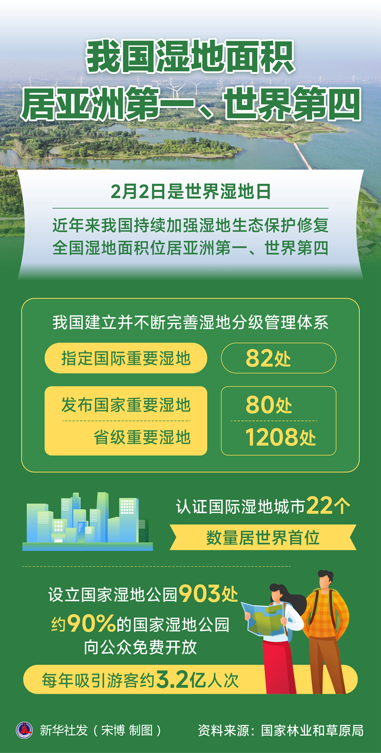 新華社北京2月2日電(記者黃垚)2月2日是世界濕地日。記者當天從國家林業(yè)和草原局獲悉,近年來我國持續(xù)加強濕地生態(tài)保護修復,全國濕地面積位居亞洲第一、世界第四,濕地保護形成重點治理和分類保護相結(jié)合的新格局。