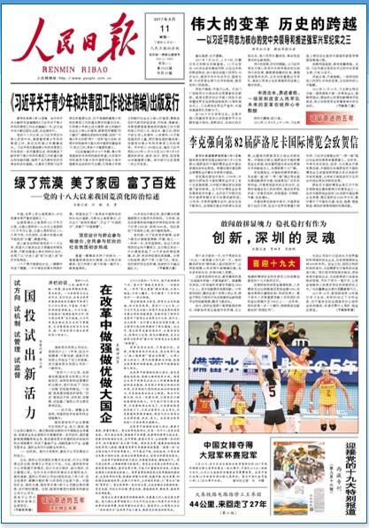 人民網(wǎng)北京9月11日電(張帆)昨晚,在2017年國(guó)際排聯(lián)女排大冠軍杯最后一輪比賽中,中國(guó)隊(duì)以3比1戰(zhàn)勝日本隊(duì),從而以五連勝的佳績(jī)奪得該項(xiàng)賽事冠軍。這是中國(guó)隊(duì)時(shí)隔16年再度奪得女排大冠軍杯。今天的《人民日?qǐng)?bào)》在頭版刊登了該消息。下為版面截圖: