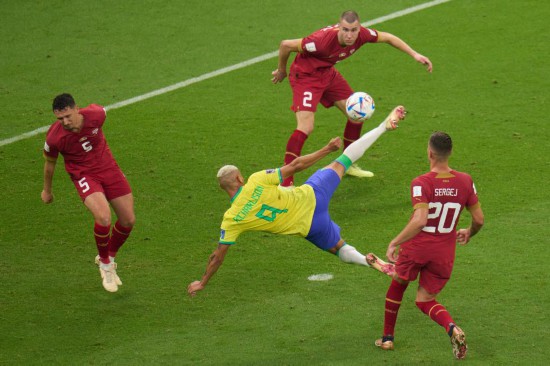 11月24日,巴西隊(duì)球員理查利森(下中)在比賽中射門得分。新華社記者孟鼎博攝 早些時(shí)候進(jìn)行的G組另外一場比賽中,瑞士隊(duì)1:0小勝喀麥隆隊(duì),恩博洛打入全場唯一進(jìn)球。下一輪,排名G組前兩位的巴西隊(duì)和瑞士隊(duì)將直接對話。(韋驊、王浩明) (責(zé)任編輯:蔡文斌) |
