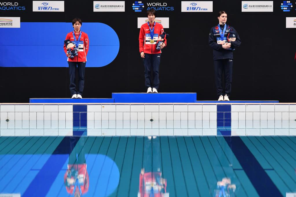 4月16日,冠軍中國(guó)選手陳芋汐(中)、亞軍中國(guó)選手全紅嬋(左)與季軍英國(guó)選手西里埃在頒獎(jiǎng)儀式上。新華社記者 張博文 攝
