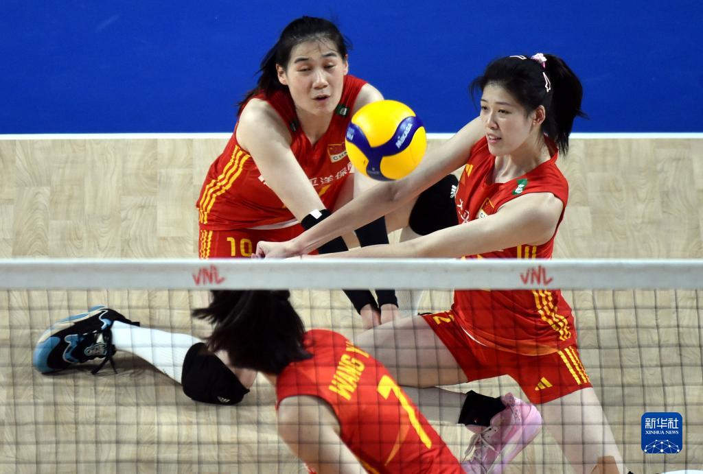 6月13日,中國隊球員袁心玥(上)在比賽中扣球。新華社記者盧炳輝攝