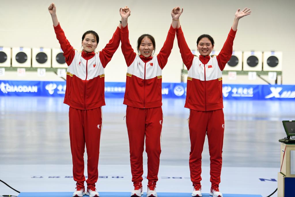 8月1日,中國隊(duì)選手熊亞瑄、林雅茜、王珂怡(從左至右)在頒獎儀式上慶祝。當(dāng)日,在成都大運(yùn)會射擊女子25米手槍比賽中,她們獲得團(tuán)體冠軍。新華社記者曹祎銘攝