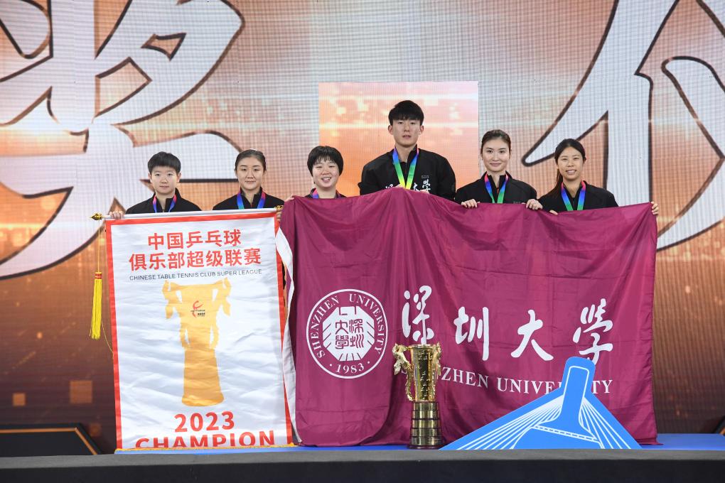 女團的冠軍爭奪更為膠著,擁有陳夢、孫穎莎兩位奧運冠軍的深圳大學(xué)隊3:2艱難戰(zhàn)勝王曼昱所在的山東魯能女隊奪冠。首盤雙打比賽,蒯曼/陳夢3:2戰(zhàn)勝范思琦/錢天一,為深圳大學(xué)隊拔得頭籌。第二盤王曼昱與孫穎莎上演“強強對話”,王曼昱3:2險勝,為山東魯能隊扳回一城。隨后陳夢3:0戰(zhàn)勝錢天一,蒯曼0:3不敵王曼昱,雙方盤分戰(zhàn)至2:2平。決勝盤中,孫穎莎3:0戰(zhàn)勝范思琦,深圳大學(xué)隊時隔三年女團再度登頂。